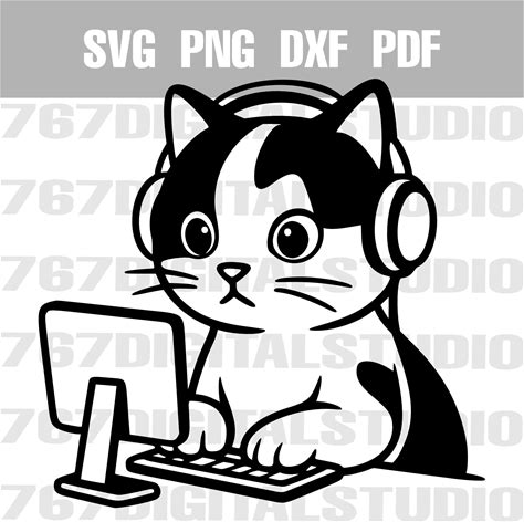 Cat At Computer SVG | Cute Gamer Kitty Clip Art | DXF PNG Pdf Vector Cut File For Cricut, Silhouette, Laser Engraving & Crafts