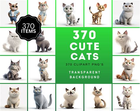 3D Cartoon Cat Clipart: 370 Transparent PNG Graphics (Digital Download)