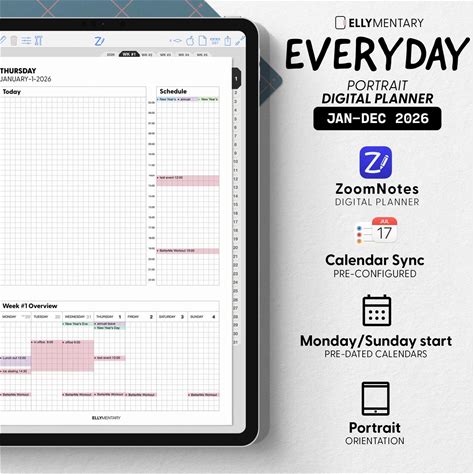 ELLYMENTARY EVERYDAY JAN 2026 Start, 12-Month Zoomnotes Calendar Sync Digital Planner, Hyperlinked Month, Weeks And Days, Portrait