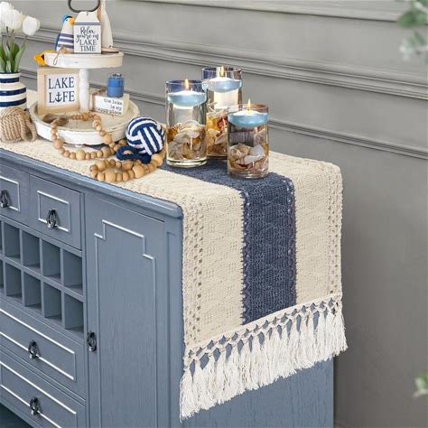 Alynsehom Macrame Table Runner Cream Beige And Blue Boho Table Runners With Tassels Hand Woven Cotton Table Runner Rustic Farmhouse Table Runners For
